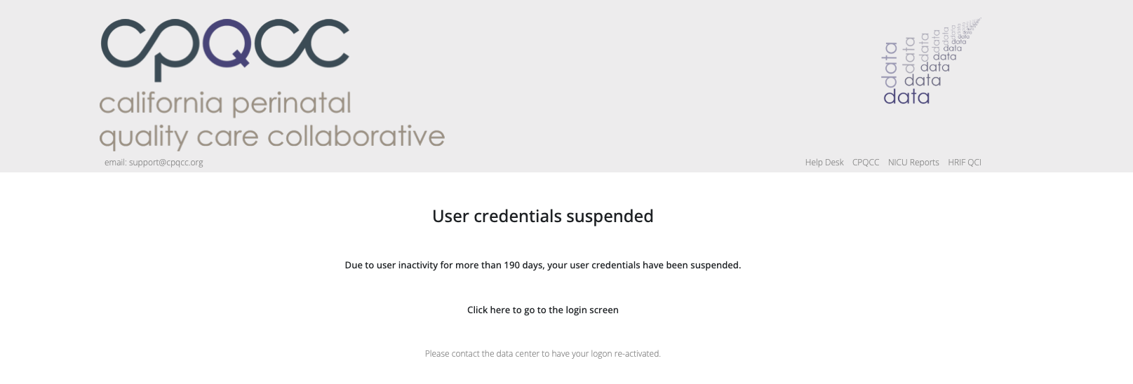 Any cpqccdata.org or cpqccreport.org account with no login activity for more than 190 days is automatically suspended.